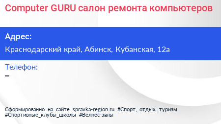 Computer GURU, салон ремонта компьютеров по адресу Краснодарский край, Абинск, Кубанская, 12а в дальнейшем Организация, размещена в следующих категориях: