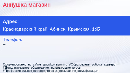 Аннушка, магазин по адресу Краснодарский край, Абинск, Крымская, 16Б в дальнейшем Организация, размещена в следующих категориях: