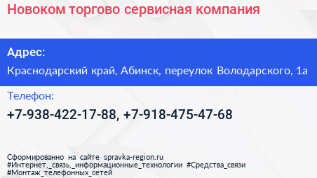 Новоком, торгово-сервисная компания по адресу Краснодарский край, Абинск, переулок Володарского, 1а в дальнейшем Организация, размещена в следующих категориях: