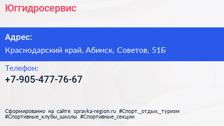 Юггидросервис по адресу Краснодарский край, Абинск, Советов, 51Б в дальнейшем Организация, размещена в следующих категориях: