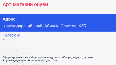 Арт, магазин обуви по адресу Краснодарский край, Абинск, Советов, 43Б в дальнейшем Организация, размещена в следующих категориях: