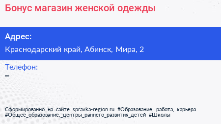 Бонус, магазин женской одежды по адресу Краснодарский край, Абинск, Мира, 2 в дальнейшем Организация, размещена в следующих категориях: