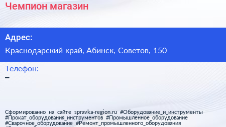 Чемпион, магазин по адресу Краснодарский край, Абинск, Советов, 150 в дальнейшем Организация, размещена в следующих категориях: