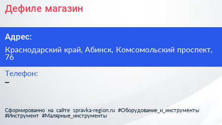 Дефиле, магазин по адресу Краснодарский край, Абинск, Комсомольский проспект, 76 в дальнейшем Организация, размещена в следующих категориях: