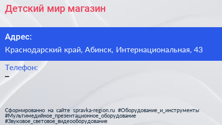 Детский мир, магазин по адресу Краснодарский край, Абинск, Интернациональная, 43 в дальнейшем Организация, размещена в следующих категориях: