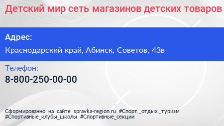 Детский мир, сеть магазинов детских товаров по адресу Краснодарский край, Абинск, Советов, 43в в дальнейшем Организация, размещена в следующих категориях: