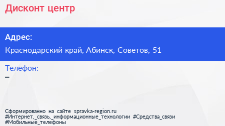 Дисконт-центр по адресу Краснодарский край, Абинск, Советов, 51 в дальнейшем Организация, размещена в следующих категориях: