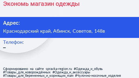 Экономь!, магазин одежды по адресу Краснодарский край, Абинск, Советов, 148в в дальнейшем Организация, размещена в следующих категориях: