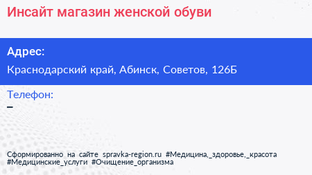 Инсайт, магазин женской обуви по адресу Краснодарский край, Абинск, Советов, 126Б в дальнейшем Организация, размещена в следующих категориях: