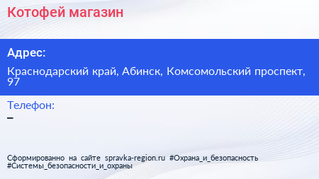 Котофей, магазин по адресу Краснодарский край, Абинск, Комсомольский проспект, 97 в дальнейшем Организация, размещена в следующих категориях: