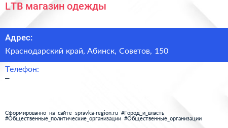 LTB, магазин одежды по адресу Краснодарский край, Абинск, Советов, 150 в дальнейшем Организация, размещена в следующих категориях:
