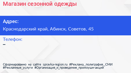 Магазин сезонной одежды по адресу Краснодарский край, Абинск, Советов, 45 в дальнейшем Организация, размещена в следующих категориях: