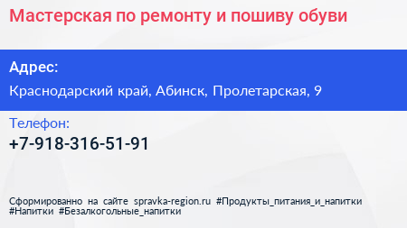 Мастерская по ремонту и пошиву обуви по адресу Краснодарский край, Абинск, Пролетарская, 9 в дальнейшем Организация, размещена в следующих категориях: