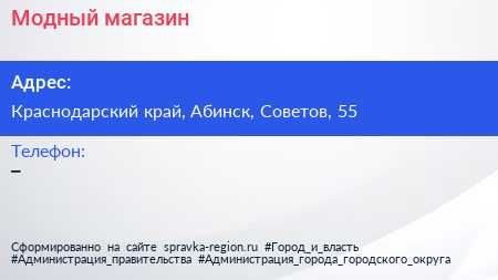 Модный, магазин по адресу Краснодарский край, Абинск, Советов, 55 в дальнейшем Организация, размещена в следующих категориях: