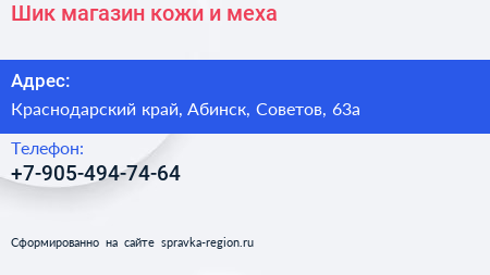 Шик, магазин кожи и меха по адресу Краснодарский край, Абинск, Советов, 63а в дальнейшем Организация, размещена в следующих категориях: