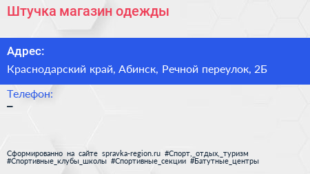 Штучка, магазин одежды по адресу Краснодарский край, Абинск, Речной переулок, 2Б в дальнейшем Организация, размещена в следующих категориях: