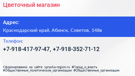 Цветочный магазин по адресу Краснодарский край, Абинск, Советов, 148в в дальнейшем Организация, размещена в следующих категориях: