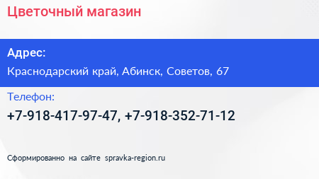 Цветочный магазин по адресу Краснодарский край, Абинск, Советов, 67 в дальнейшем Организация, размещена в следующих категориях: