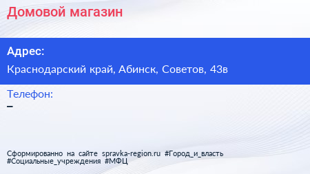 Домовой, магазин по адресу Краснодарский край, Абинск, Советов, 43в в дальнейшем Организация, размещена в следующих категориях:
