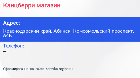 Канцберри, магазин по адресу Краснодарский край, Абинск, Комсомольский проспект, 64Б в дальнейшем Организация, размещена в следующих категориях: