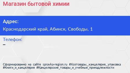 Магазин бытовой химии по адресу Краснодарский край, Абинск, Свободы, 1 в дальнейшем Организация, размещена в следующих категориях: