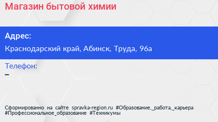 Магазин бытовой химии по адресу Краснодарский край, Абинск, Труда, 96а в дальнейшем Организация, размещена в следующих категориях: