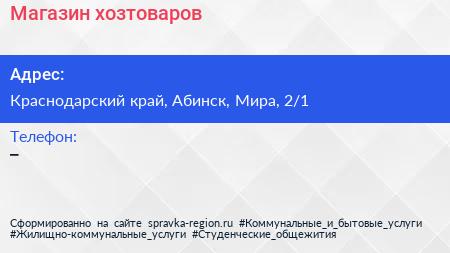 Магазин хозтоваров по адресу Краснодарский край, Абинск, Мира, 2/1 в дальнейшем Организация, размещена в следующих категориях: