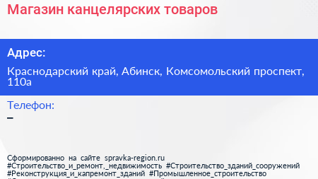 Магазин канцелярских товаров по адресу Краснодарский край, Абинск, Комсомольский проспект, 110а в дальнейшем Организация, размещена в следующих категориях: