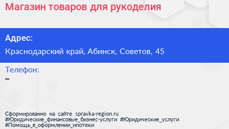 Магазин товаров для рукоделия по адресу Краснодарский край, Абинск, Советов, 45 в дальнейшем Организация, размещена в следующих категориях: