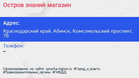 Остров знаний, магазин по адресу Краснодарский край, Абинск, Комсомольский проспект, 78 в дальнейшем Организация, размещена в следующих категориях:
