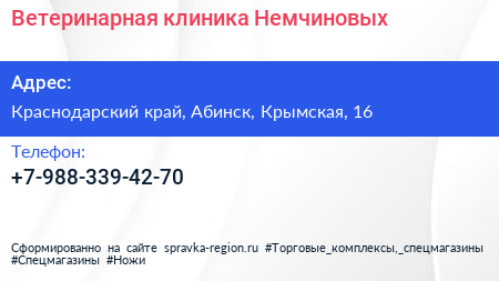 Ветеринарная клиника Немчиновых по адресу Краснодарский край, Абинск, Крымская, 16 в дальнейшем Организация, размещена в следующих категориях: