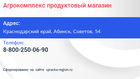 Агрокомплекс, продуктовый магазин по адресу Краснодарский край, Абинск, Советов, 54 в дальнейшем Организация, размещена в следующих категориях: