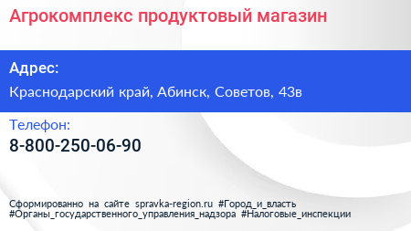 Агрокомплекс, продуктовый магазин по адресу Краснодарский край, Абинск, Советов, 43в в дальнейшем Организация, размещена в следующих категориях: