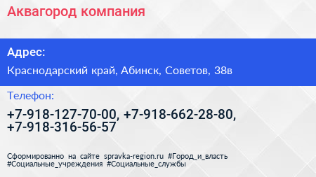 Аквагород, компания по адресу Краснодарский край, Абинск, Советов, 38в в дальнейшем Организация, размещена в следующих категориях: