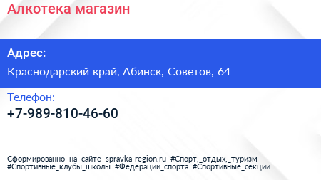 Алкотека, магазин по адресу Краснодарский край, Абинск, Советов, 64 в дальнейшем Организация, размещена в следующих категориях: