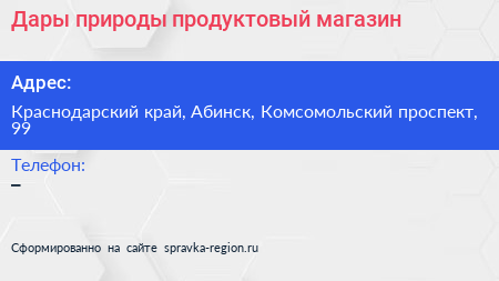 Дары природы, продуктовый магазин по адресу Краснодарский край, Абинск, Комсомольский проспект, 99 в дальнейшем Организация, размещена в следующих категориях: