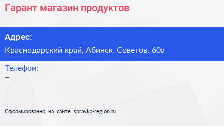 Гарант, магазин продуктов по адресу Краснодарский край, Абинск, Советов, 60а в дальнейшем Организация, размещена в следующих категориях: