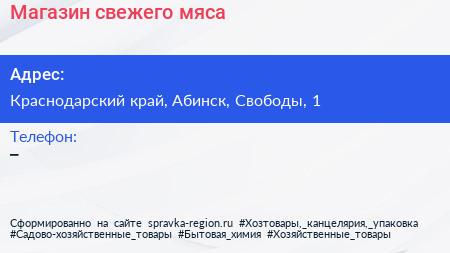 Магазин свежего мяса по адресу Краснодарский край, Абинск, Свободы, 1 в дальнейшем Организация, размещена в следующих категориях: