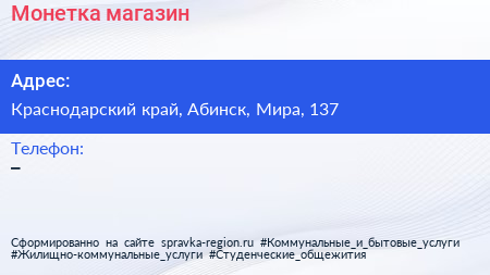 Монетка, магазин по адресу Краснодарский край, Абинск, Мира, 137 в дальнейшем Организация, размещена в следующих категориях: