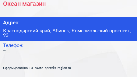Океан, магазин по адресу Краснодарский край, Абинск, Комсомольский проспект, 93 в дальнейшем Организация, размещена в следующих категориях: