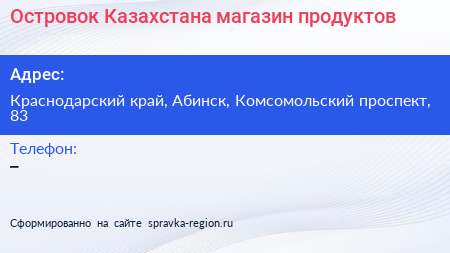 Островок Казахстана, магазин продуктов по адресу Краснодарский край, Абинск, Комсомольский проспект, 83 в дальнейшем Организация, размещена в следующих категориях: