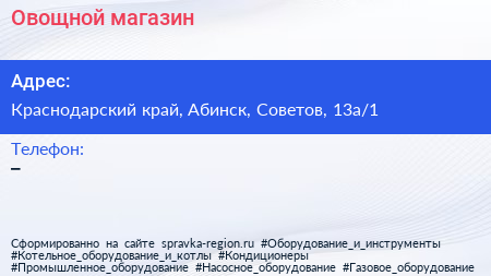Овощной магазин по адресу Краснодарский край, Абинск, Советов, 13а/1 в дальнейшем Организация, размещена в следующих категориях: