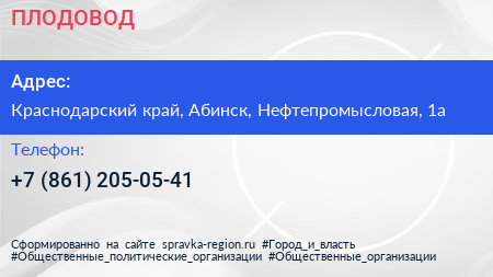 ПЛОДОВОД по адресу Краснодарский край, Абинск, Нефтепромысловая, 1а в дальнейшем Организация, размещена в следующих категориях: