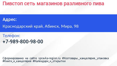 Пивстоп, сеть магазинов разливного пива по адресу Краснодарский край, Абинск, Мира, 98 в дальнейшем Организация, размещена в следующих категориях:
