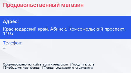 Продовольственный магазин по адресу Краснодарский край, Абинск, Комсомольский проспект, 110а в дальнейшем Организация, размещена в следующих категориях: