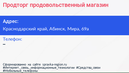 Продторг, продовольственный магазин по адресу Краснодарский край, Абинск, Мира, 69а в дальнейшем Организация, размещена в следующих категориях: