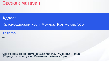 Свежак, магазин по адресу Краснодарский край, Абинск, Крымская, 16Б в дальнейшем Организация, размещена в следующих категориях:
