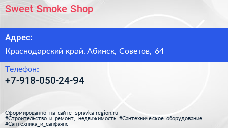 Sweet Smoke Shop по адресу Краснодарский край, Абинск, Советов, 64 в дальнейшем Организация, размещена в следующих категориях: