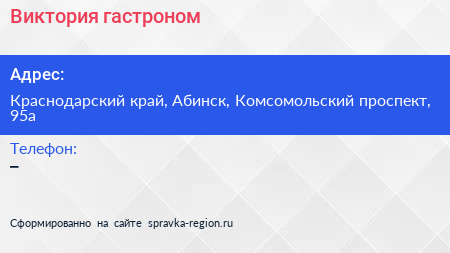 Виктория, гастроном по адресу Краснодарский край, Абинск, Комсомольский проспект, 95а в дальнейшем Организация, размещена в следующих категориях: