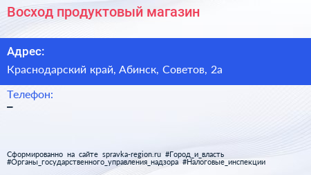 Восход, продуктовый магазин по адресу Краснодарский край, Абинск, Советов, 2а в дальнейшем Организация, размещена в следующих категориях:
